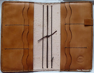 At the moment, I'm in my Meadowgate Leather (see here for my initial review of it). It's a Snowbell, but with card slots in the back cover as well as the front cover, and in cahier size, rather than regular. I have a Traveller's Company (used to be Midori) vertical week to view diary in it, a zipper pocket insert for money and a notebook in the back for notes out and about. All my cards are held in the cover card slots and there is space in the vertical pockets behind the card slots for receipts etc.